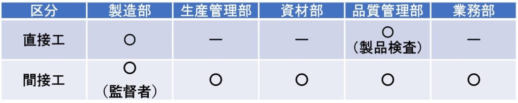 製品の加工・組立・仕上げ作業など、製品の製造作業に直接従事する工場従業員が該当します。 また、製品の検査工程に従事する工場従業員についても、製品ごとの作業時間が明確にできるのであれば、直接工に含めることにより、製品ごとの製造作業時間をより正確に計算することができます。