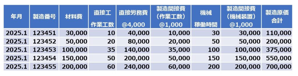 上記2.及び3.で集計した製品別・製造番号別の直接作業工数及び機械装置の稼働時間に、上記5.で計算した配賦率(レート)を掛け算することにより、製品別・製造番号別の製造間接費を計算します。また、材料費等と合計することにより、製品別・製造番号別の製造原価が明らかになります。