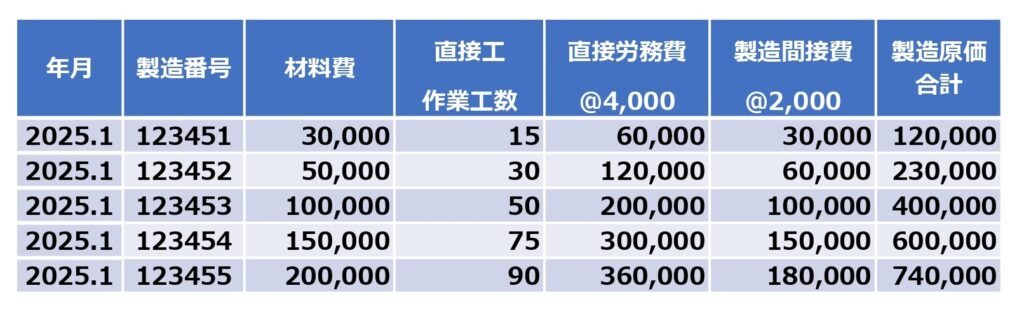 上記2.で集計した製品別・製造番号別の直接作業工数に、上記4.で計算した配賦率(レート)を掛け算することにより、製品別・製造番号別の製造間接費を計算します。また、材料費等と合計することにより、製品別・製造番号別の製造原価が明らかになります。