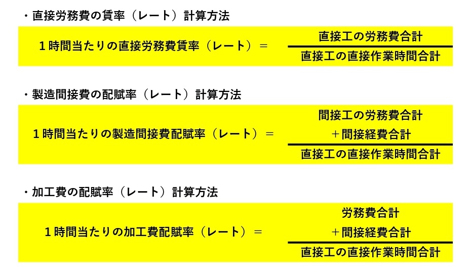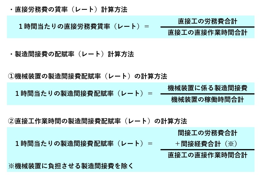 製造間接費の配賦基準に機械装置の稼働時間を加える場合、直接工の直接作業時間を配賦基準とする配賦率(レート)と、機械装置の稼働時間を配賦基準とする配賦率(レート)に分けて計算する必要があり、それぞれ次の計算式となります。 ※直接費の賃率(レート)の計算方法も合わせてご案内します。
